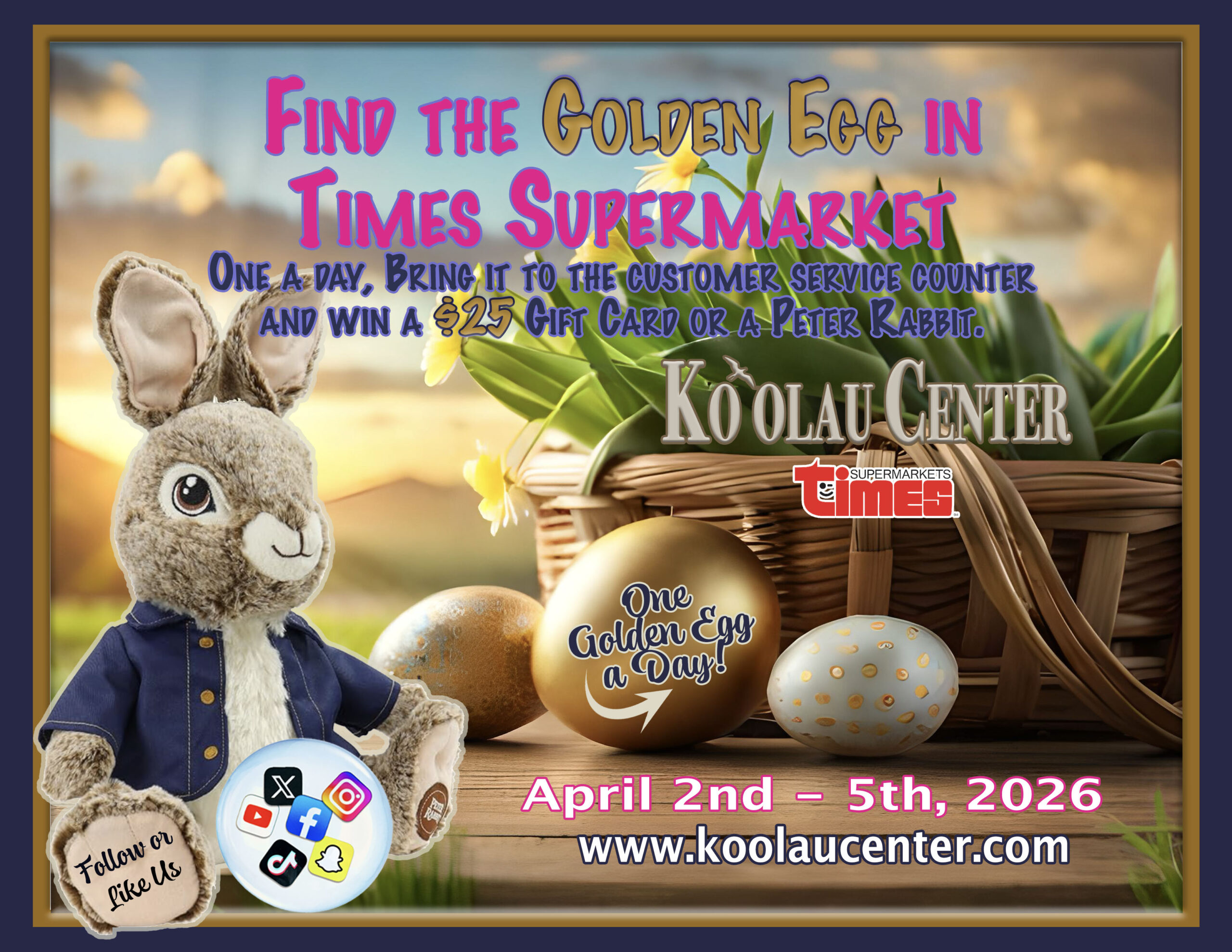Come join the fun, we have an Easter Hunt that you wanna take part in. Find the golden Egg, April 2 – 5, 2026. It’s super easy and fun for the whole family. So stop into Times while shopping for your Easter Family Feast or your Easter Baskets for the keiki, and everyone can help look for the Golden Egg. One Egg per day, April 2 – 5, once you find the Golden Egg, take it to the Customer Service Counter and redeem your Egg for your Prize.